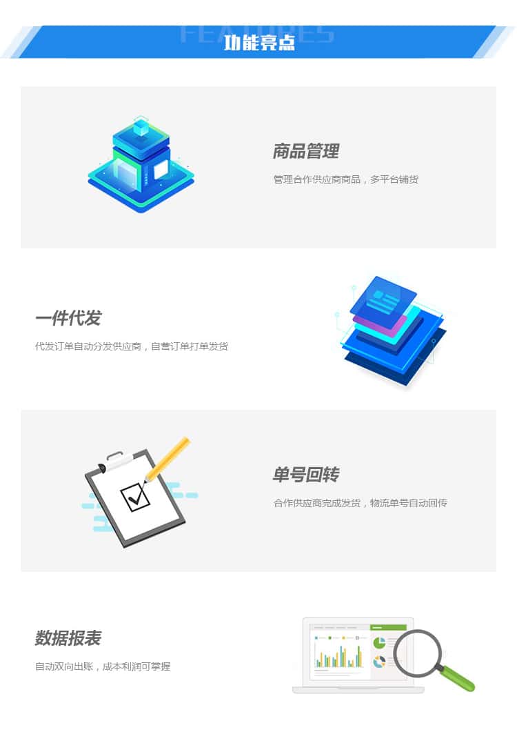 XK一件代发系统,电商卖家企业使用,可做商品资料、入库预报、提交代发指令、支付运费、仓储费.查询包裹的快递物流运输轨迹等;物流仓储公司内部使用,可做内部的仓库操作、入库扫描、审核、出库捡货、出库扫描、拍照、物流打单、装车操作、运单绑定、财务操作等。商品、订单、售后、库存全链路跨企业协同,优化代发业务链路,降本增效。